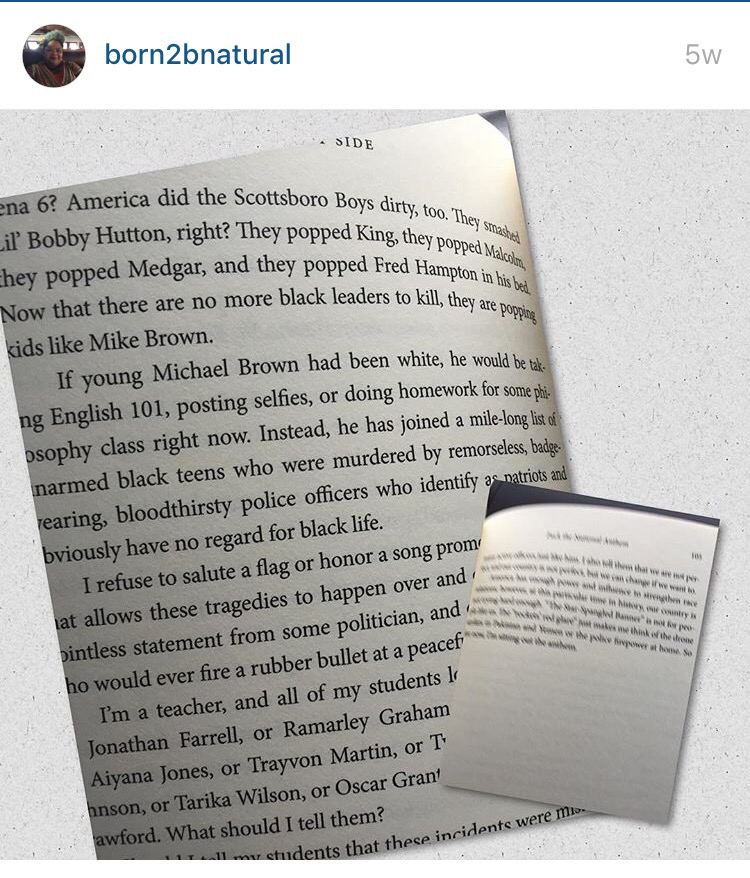 This passage caused me to really think about the Pledge of Allegiance and what it means to me as a Black women, and I realized it’s not for me. Just as the writer realized it wasn’t for him. Now, I can no longer stand and take that pledge. I have not experienced liberty and justice for all.
